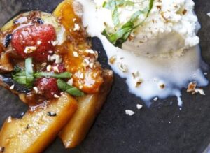 FRUTA EM COMPOTA COM SORVETE DE BAUNILHA, PALIEN E MENTA